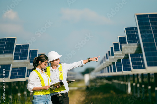 Asian Young Inspector Engineer man and female walking checking operation in solar farm