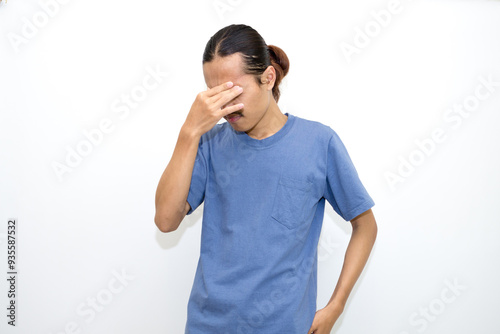 Asian young man wearing dark blue t-shirt suffering from headache, pressing hand to forehead, to relieve pain with pain facial expression