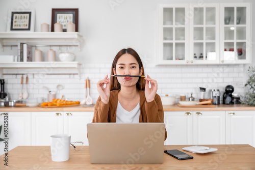 Asian young woman seriously working on computer laptop in house. She thinking find solution problem of work