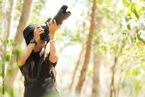 Asian woman exploring forest green natural capturing beauty nature outdoor. Photographer backpack adventure walking and holding camera for take a photo for explore trip