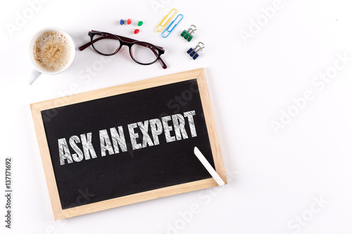 ASK AN EXPERT word on Chalkboard with Coffee Cup, view from above