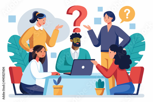 Ask questions for help or solution, confusion, doubt or query for answer and information, business discussion to solve problem concept, business people employee ask questions with question mark signs