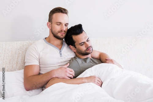 Asleep gay couple lying in bed