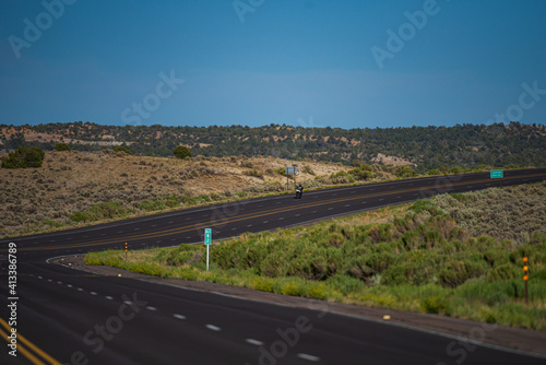 Asphalt highway and hill landscape under the blue sky. American road on travel vacation.