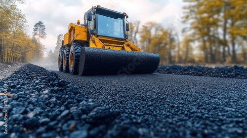 Asphalt paver laying fresh asphalt on a country road surrounded by trees