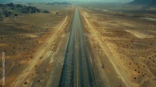 Asphalt road in the middle of the arid desert seen from aerial view.