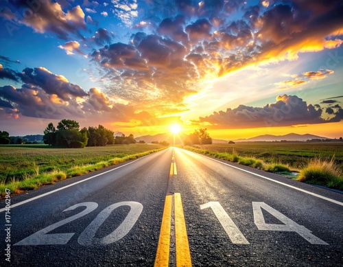 Asphalt Road Leading to a Vibrant Sunset with Dramatic Clouds and Horizon Silhouette Landscape View in Golden and Blue Tones