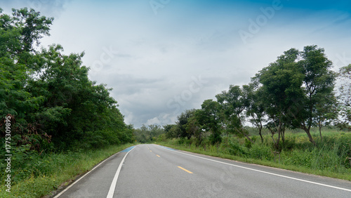 Asphalt road leading to the destination ahead. Two side of road with nature of trees and grees grass. Under blue sky and white clouds. Clear roads for tourism.