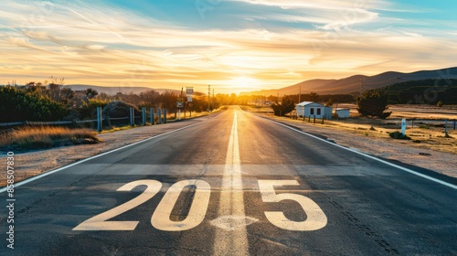 Asphalt Road Leading to the Horizon at Sunset with 2015 Painted on the Road