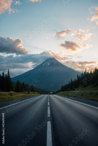 Asphalt road square and green mountain with sky clouds natural landscape at dusk. car background.