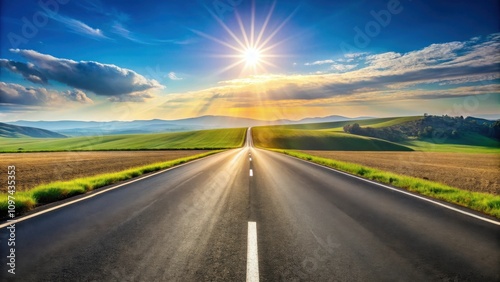 Asphalt road stretching towards a vibrant sunset over rolling green hills and a sunburst sky