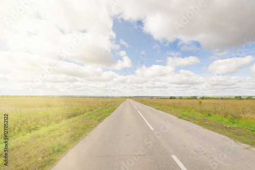Asphalt road through the field with green grass under blue sky with clouds