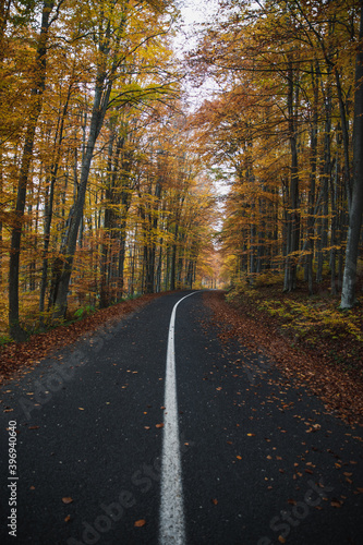 Asphalt road with fallen leaves in autumn forest.