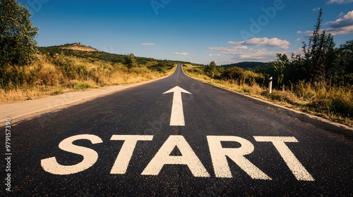 Asphalt Road with White Arrow and Start Sign.