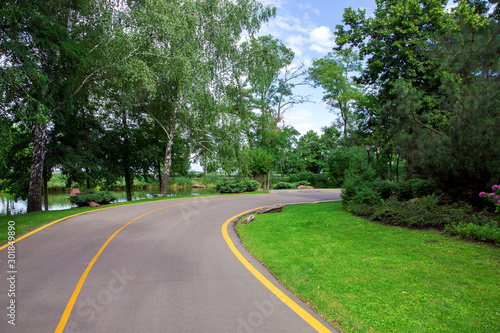 asphalt road with yellow markings leaving for a turn in the park with a green lawn and trees on the side of the road and a river with a blue sky in the background.