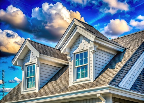 Asphalt shingle gable roof, sharply detailed, with a dormer window set against a bright blue sky.