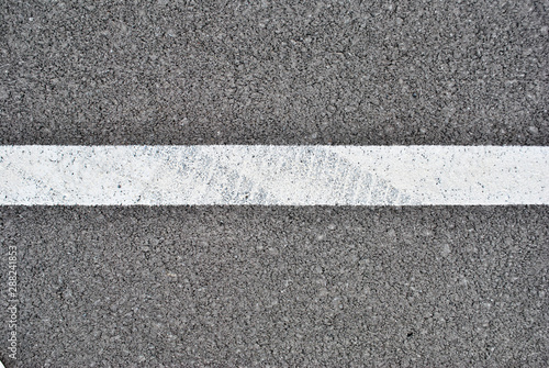 Asphalt texture with white line and tire marks . Top view
