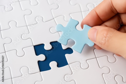 Assembling a puzzle piece home visual art indoor close-up focused mind