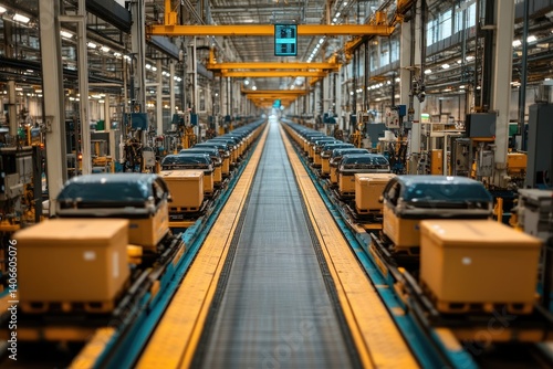 Assembly line with finished goods moving along the conveyor in a modern factory interior