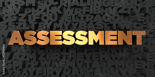 Assessment - Gold text on black background - 3D rendered royalty free stock picture. This image can be used for an online website banner ad or a print postcard.