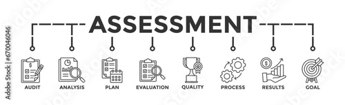 Assessment banner web icon for accreditation and evaluation method on business and education with audit, analysis, plan, evaluation, quality,process,results and goal icon