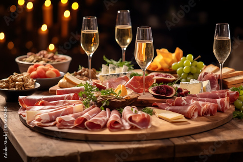 Assorted appetizers on a wooden table with glasses of white wine