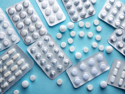 Assorted Blister Packs and Loose Pills on Light Blue Surface for Clinical and Pharmaceutical Themes, Perfect for Health and Medicine Related Content