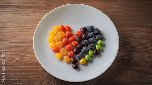Assorted Candies Arranged in Perfect Heart Shape on a White Plate over Wooden Surface