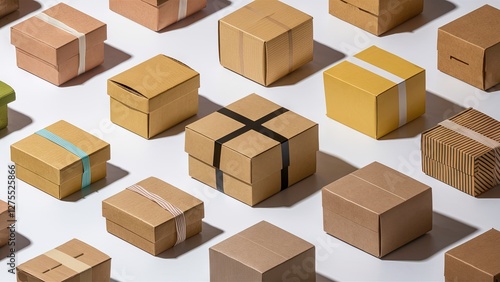 Assorted cardboard boxes in various sizes and colors including yellow, brown, and green arranged symmetrically on a clean white background