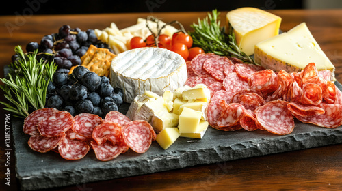 Assorted cheese and charcuterie platter with grapes and tomatoes on slate board