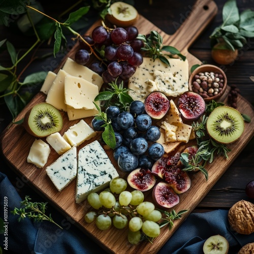 Assorted Cheeses, Honey, Figs, and Grapes Served on Wooden Board for Gourmet Dining