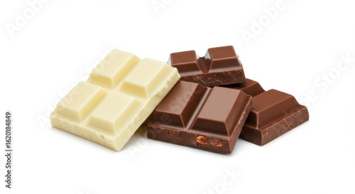Assorted chocolate bars: dark, milk, and white chocolate selection on white background
