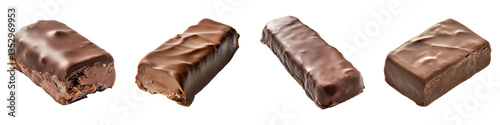 Assorted chocolate candy bars, rectangular treats displayed sidebyside, with one candy bar showing a bite mark.