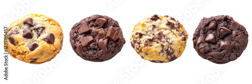 Assorted chocolate chip cookies in various flavors on transparent background png