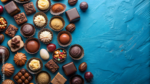 Assorted chocolates and candies arranged on blue background, perfect for advertising copy or text space