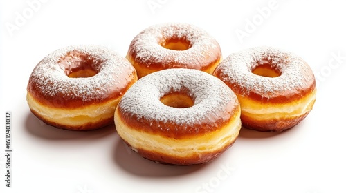 Assorted classic glazed donuts with powdered sugar topping arranged on a white background perfect for bakery shop advertisements or food blogging