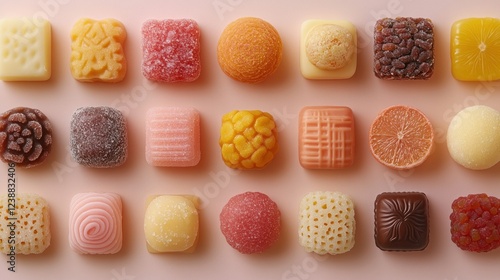 Assorted colorful candy squares and round shapes on pink background.