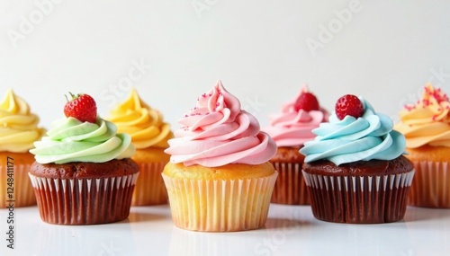 Assorted colorful cupcakes, white backdrop, vibrant frosting, treat, fun, colorful