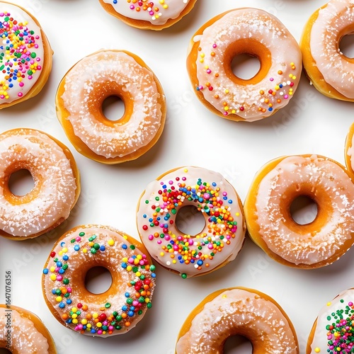 Assorted colorful donuts with sprinkles arranged aesthetically on a white background, ideal for dessert promotion