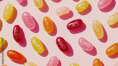 Assorted Colorful Jelly Beans Spread Across a Soft Pink Background, Capturing the Joy and Vibrancy of Candy Treats Perfect for Sweet Celebrations and Festive Events