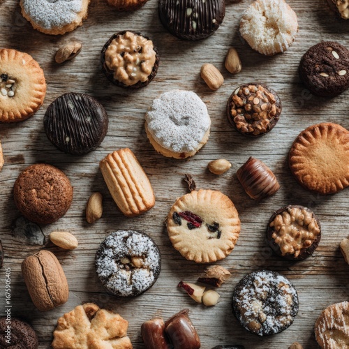 Assorted cookies and pastries arranged on a rustic wooden surface, showcasing a variety of textures, colors, and shapes, perfect for dessert lovers and culinary enthusiasts