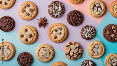 Assorted cookies arranged on a pastel blue and pink background, featuring chocolate chip, peanut butter, and decorated varieties, top view layout.