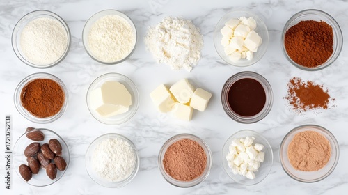Assorted Cooking Ingredients in Glass Bowls on Marble Surface