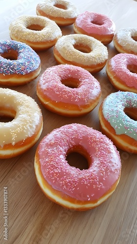 Assorted Delicious Donuts with Sprinkles on Wooden Table