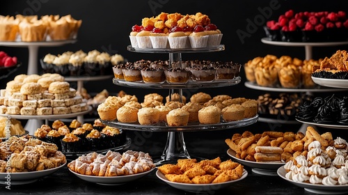 Assorted delicious pastries and desserts on tiered stands.