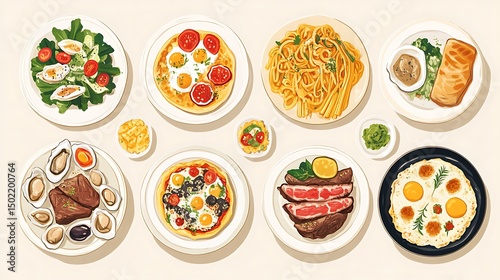 Assorted dishes of food displayed on plates.