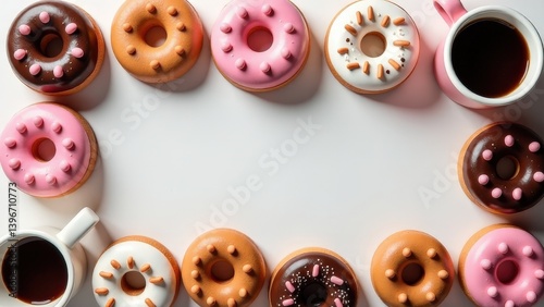 Assorted donuts and coffee cups on a table with white background.