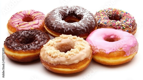 Assorted donuts on a white background showcasing a variety of flavors and toppings for food and dessert concepts.