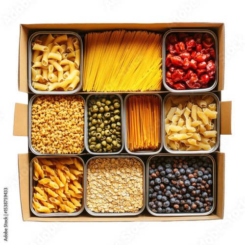 Assorted Dried Pasta and Grains in a Rustic Box Arrangement for Culinary Inspiration on transparent background