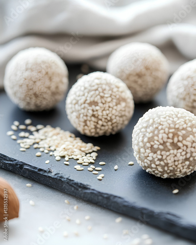 Assorted energy balls coated with sesame seeds and coconut, arranged on a dark slate with a dynamic floating effect